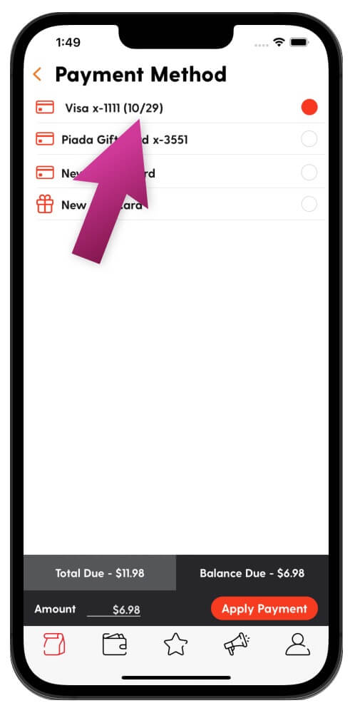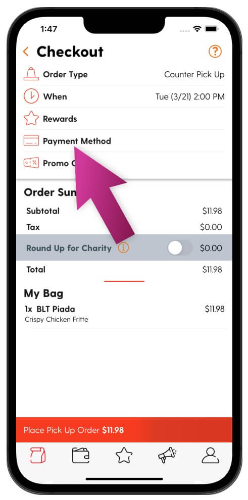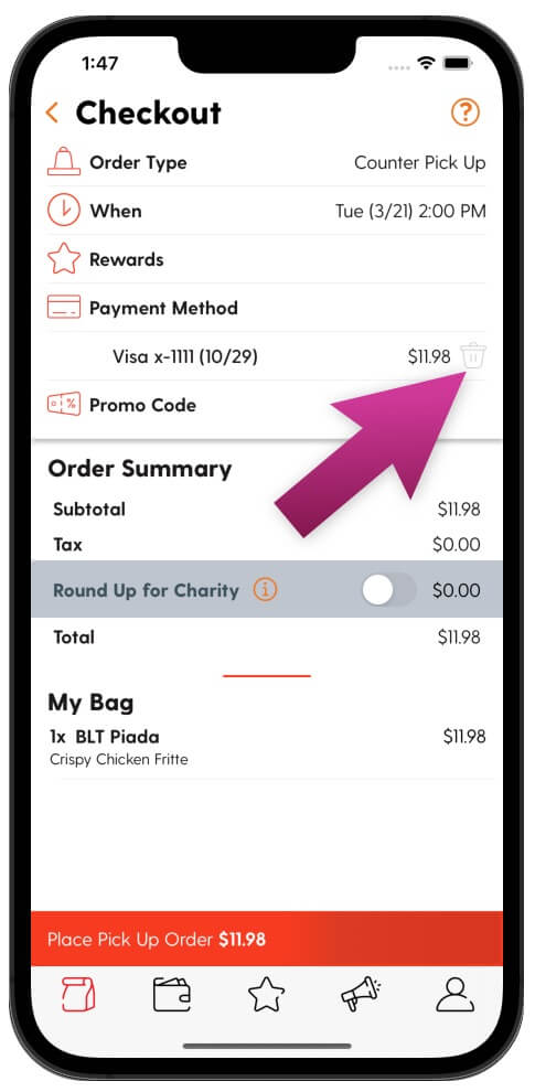 Once you have removed the default saved card, you will be able to tap on the Payment Method row to add a new card or select a different saved card from your account.