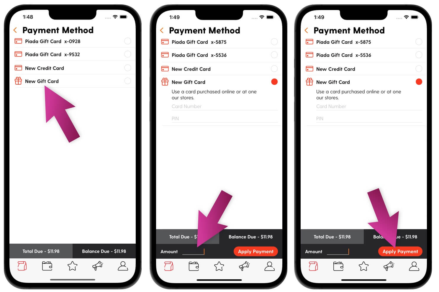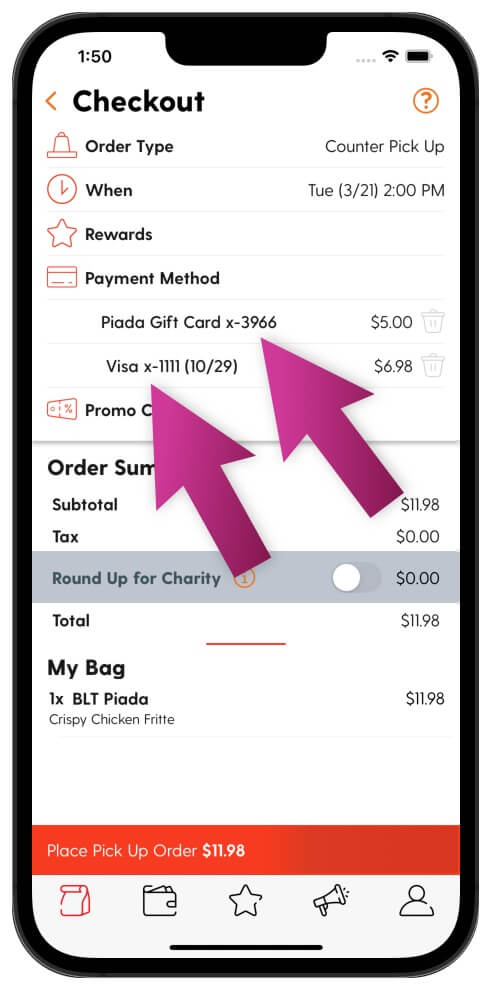 Note: Adjustments to the total cost of the basket (such as by updating items, updating the order tip, or applying and removing discounts) will automatically update the total payment amount of your multiple payment methods so it is safest to finalize these changes prior to selecting your payment methods if you are using gift cards or other methods that require a specific preset amount to be charged to them.